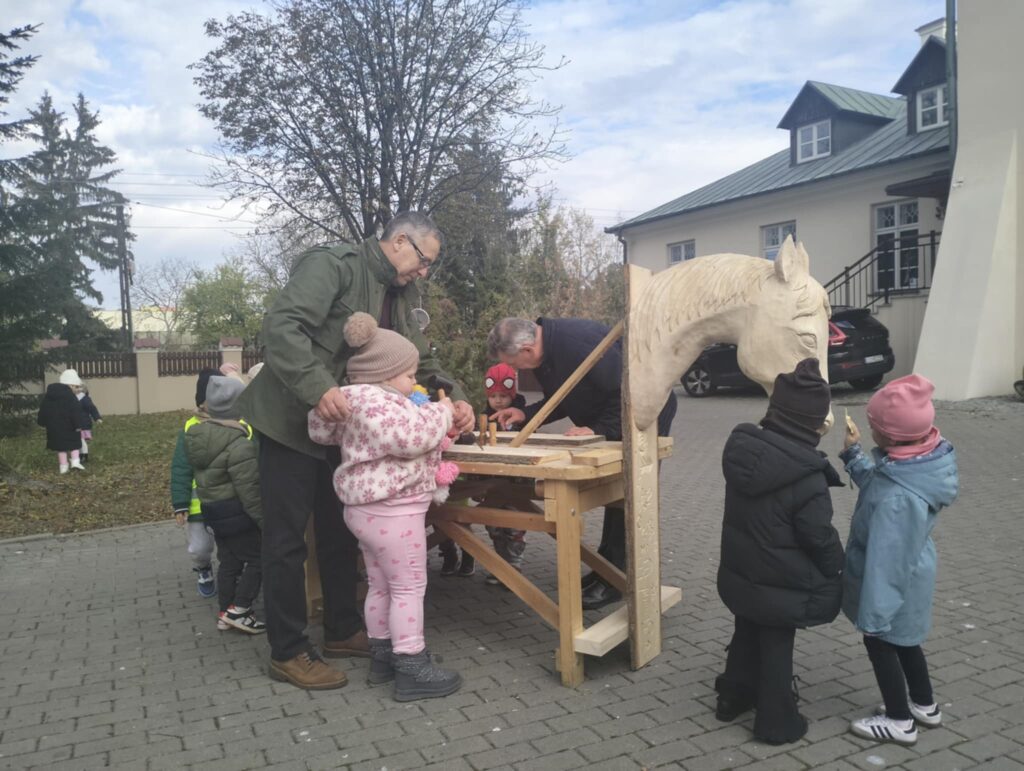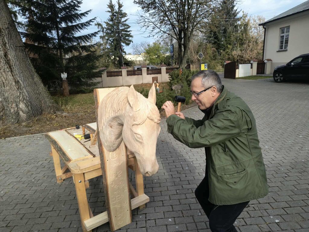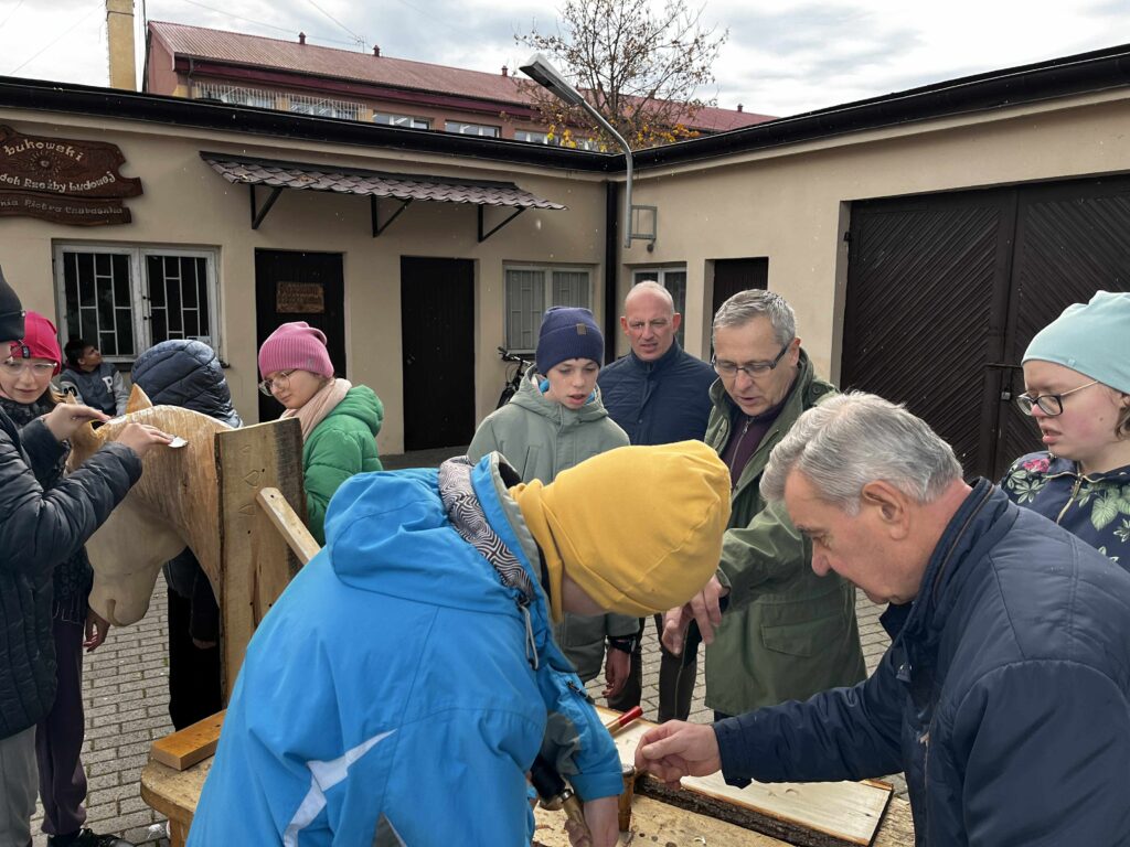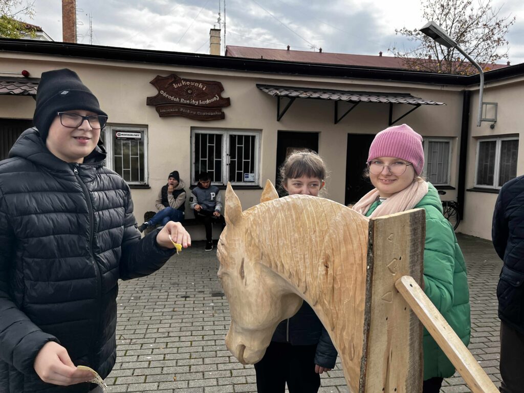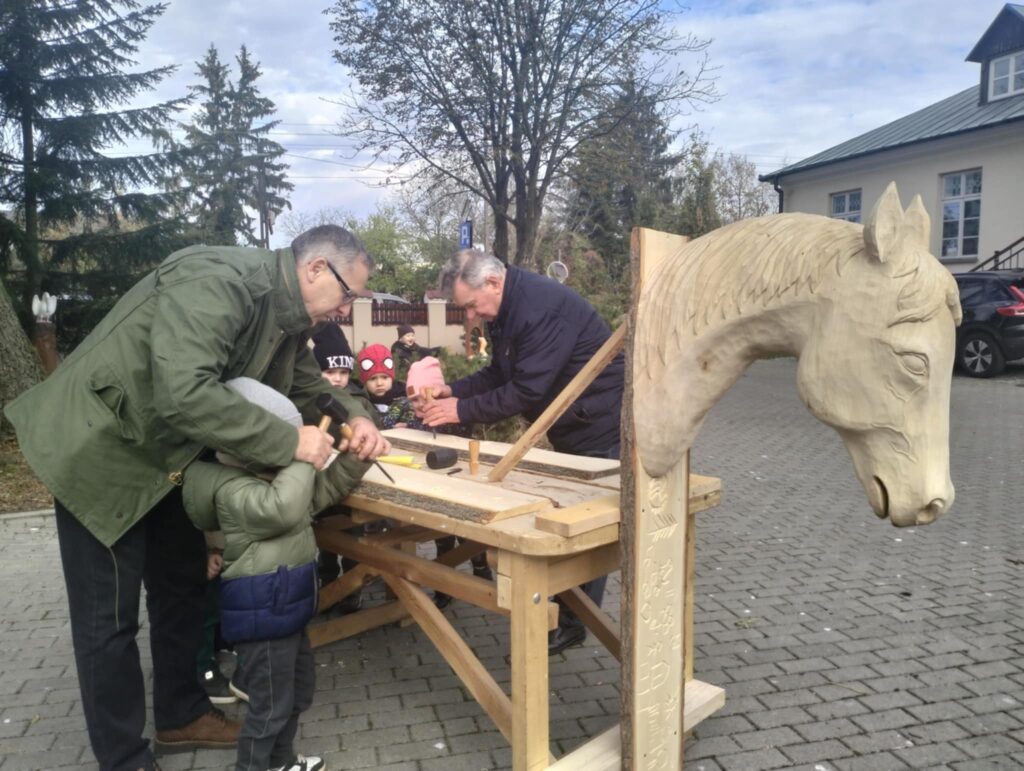 22 października br. na dziedzińcu Muzeum Regionalnego w Łukowie można było spotkać się ze znanymi łukowskimi rzeźbiarzami Panem Krzysztofem Osakiem oraz Panem Mieczysławem Gają. Twórcy ludowi opowiedzieli o realizowanym projekcie, w ramach którego w pracowni muzealnej przeprowadzili warsztaty rzeźbiarskie dla dzieci i młodzieży z terenu Powiatu Łukowskiego. W cyklicznych warsztatach wzięło udział 16 osób. Podczas spotkania odbył się również pokaz rzeźbienia i mini warsztaty. Wielkim entuzjazmem wśród uczestników cieszyła się głowa konia wyrzeźbiona przez Pana Krzysztofa Osaka, którą młodzież wyczyściła i przygotowała do nałożenia polichromii. Inni próbowali swoich sił w rzeźbiarstwie zapoznając się z narzędziami i rzeźbiąc proste wzory na lipowej desce. Spotkanie zakończyło się wspólnym zwiedzaniem muzeum.