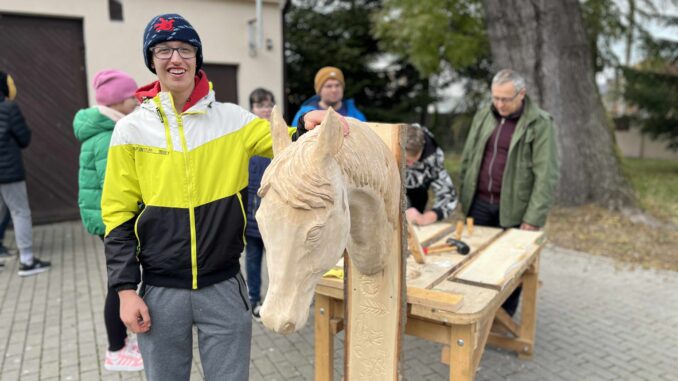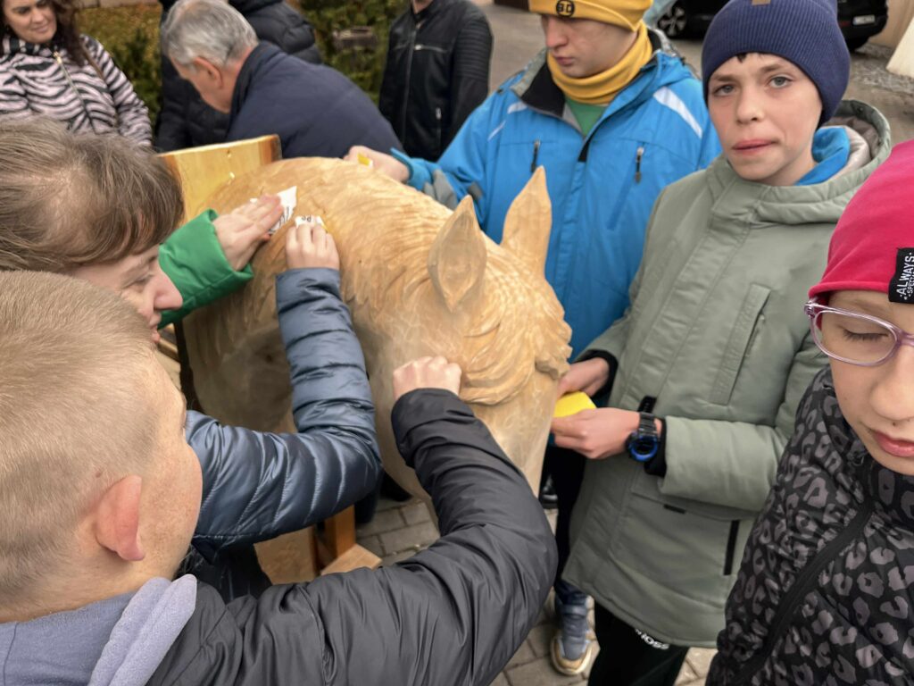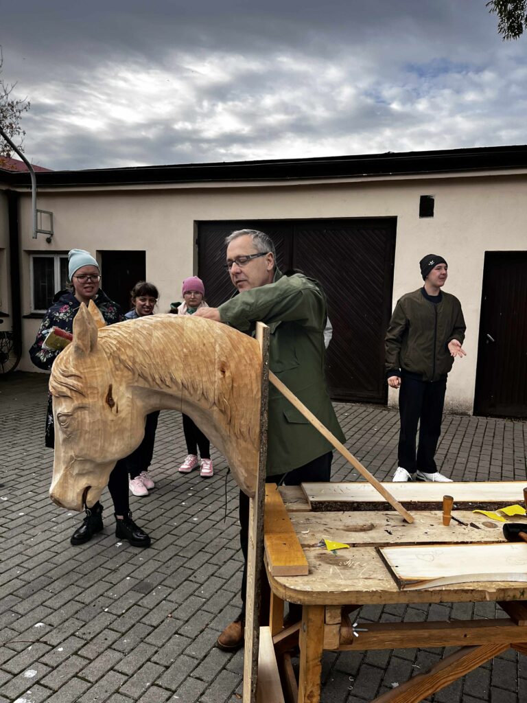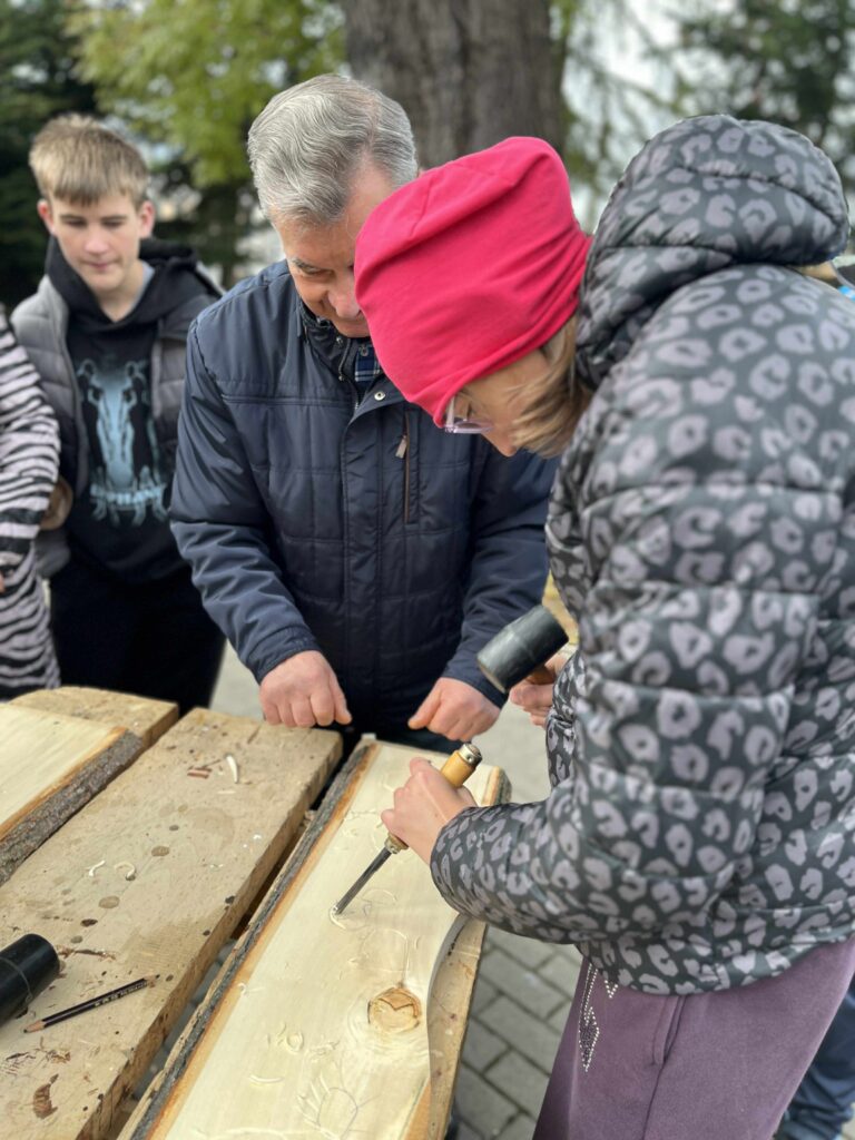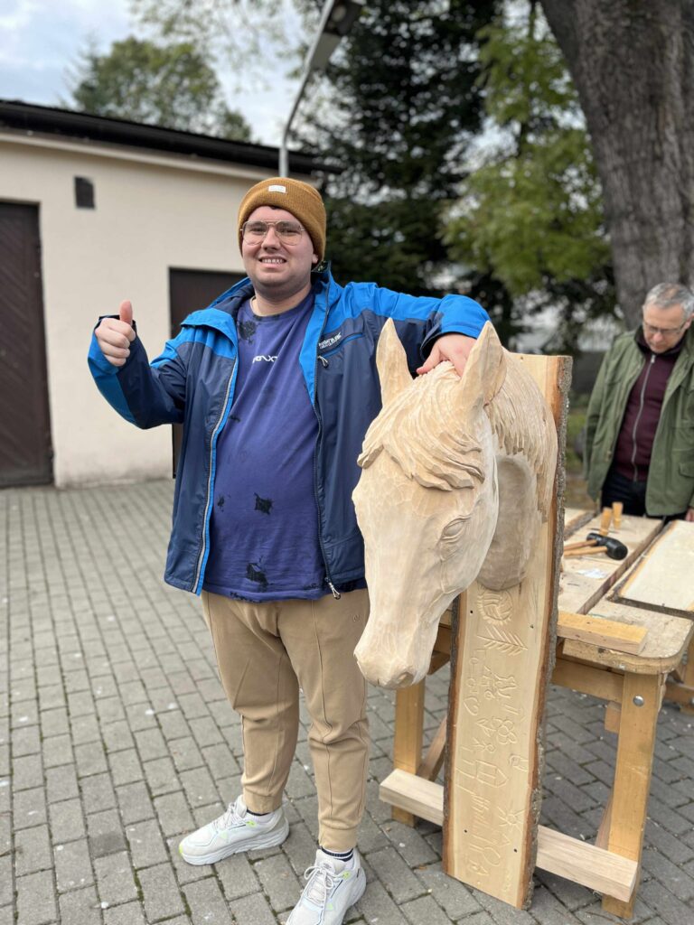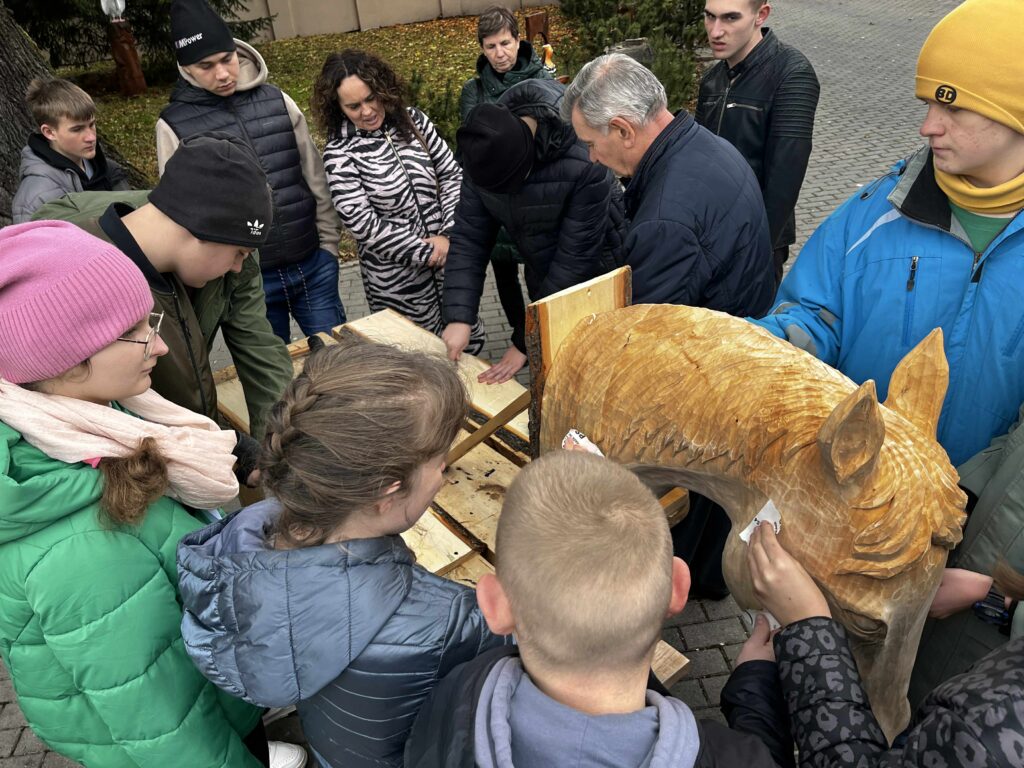 22 października br. na dziedzińcu Muzeum Regionalnego w Łukowie można było spotkać się ze znanymi łukowskimi rzeźbiarzami Panem Krzysztofem Osakiem oraz Panem Mieczysławem Gają. Twórcy ludowi opowiedzieli o realizowanym projekcie, w ramach którego w pracowni muzealnej przeprowadzili warsztaty rzeźbiarskie dla dzieci i młodzieży z terenu Powiatu Łukowskiego. W cyklicznych warsztatach wzięło udział 16 osób. Podczas spotkania odbył się również pokaz rzeźbienia i mini warsztaty. Wielkim entuzjazmem wśród uczestników cieszyła się głowa konia wyrzeźbiona przez Pana Krzysztofa Osaka, którą młodzież wyczyściła i przygotowała do nałożenia polichromii. Inni próbowali swoich sił w rzeźbiarstwie zapoznając się z narzędziami i rzeźbiąc proste wzory na lipowej desce. Spotkanie zakończyło się wspólnym zwiedzaniem muzeum.