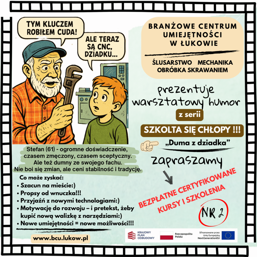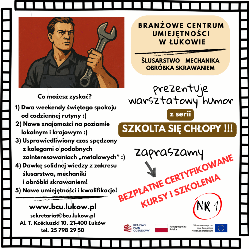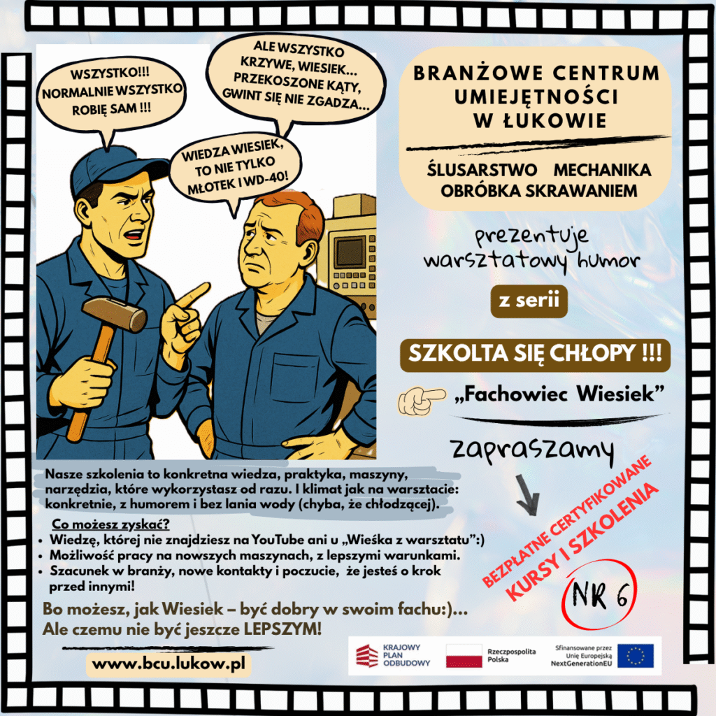 W Branżowym Centrum Umiejętności (BCU) w Łukowie od czerwca ruszyła nowa, dynamiczna seria postów i plakatów: „Szkolta się CHŁOPY!”. To inicjatywa, która ma na celu nie tylko edukować ale i z humorem zachęcać do nieustannego rozwoju w fascynującym świecie obrabiarek CNC i nowoczesnych technologii. Tytułowe „CHŁOPY” to nie tylko panowie – to każdy, kto ma w sobie ducha innowacji i chęci do nauki, niezależnie od wieku czy płci!