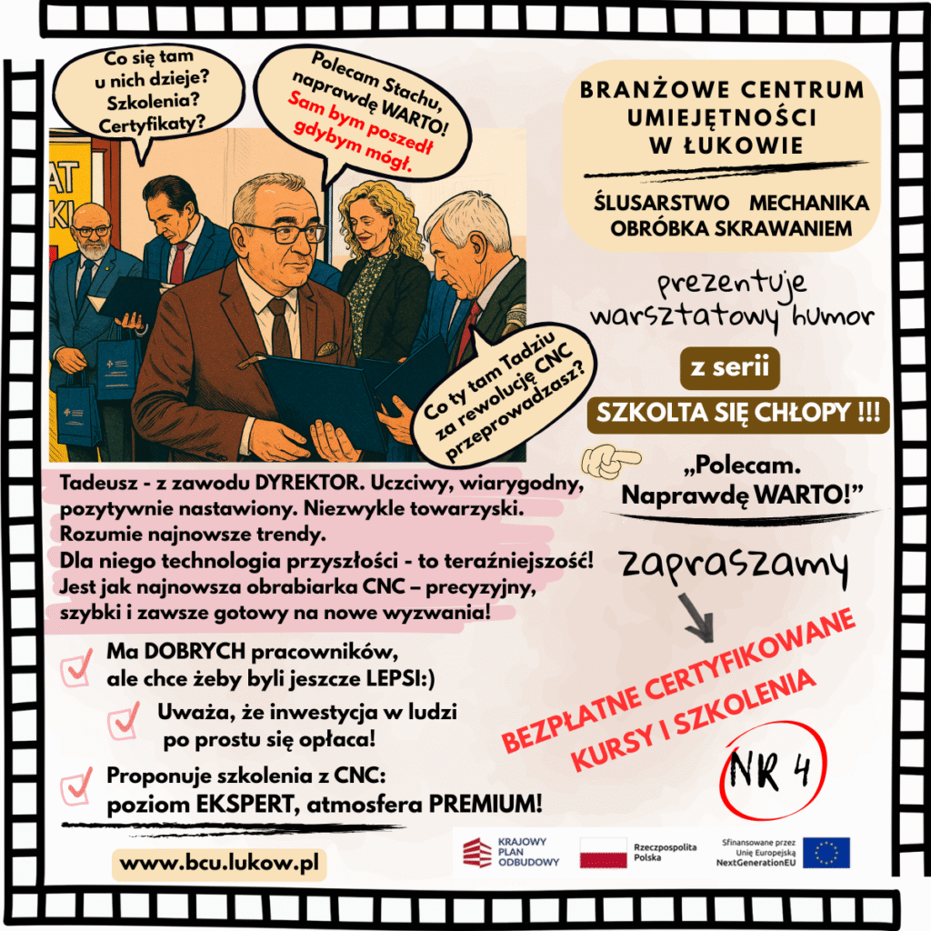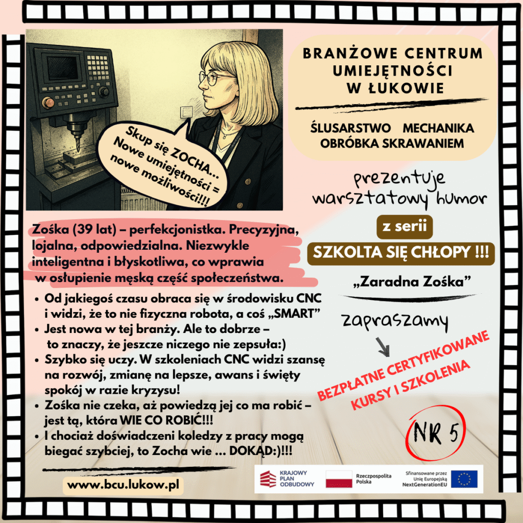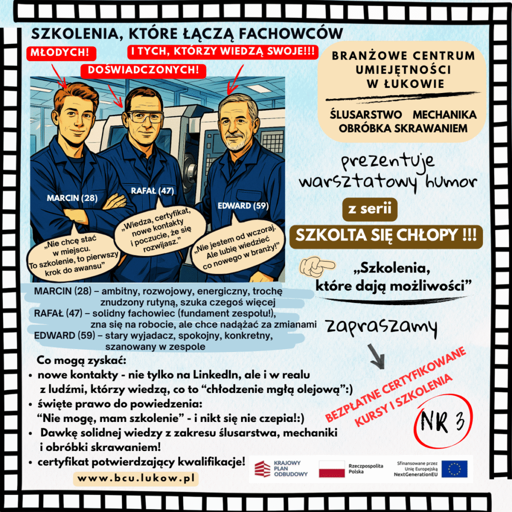 W Branżowym Centrum Umiejętności (BCU) w Łukowie od czerwca ruszyła nowa, dynamiczna seria postów i plakatów: „Szkolta się CHŁOPY!”. To inicjatywa, która ma na celu nie tylko edukować ale i z humorem zachęcać do nieustannego rozwoju w fascynującym świecie obrabiarek CNC i nowoczesnych technologii. Tytułowe „CHŁOPY” to nie tylko panowie – to każdy, kto ma w sobie ducha innowacji i chęci do nauki, niezależnie od wieku czy płci!