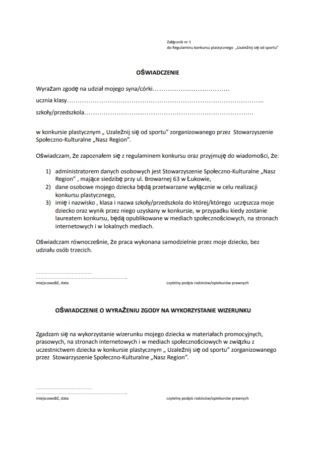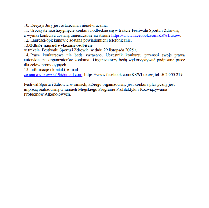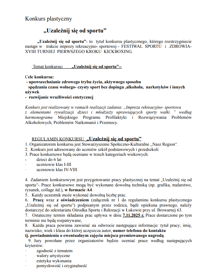 Klub Sportów Walki Łuków , Stowarzyszenie Społeczno-Kulturalne „Nasz Region” i Ośrodek Sportu i Rekreacji zapraszają do udziału w cyklicznym konkursie plastycznym pt. „Uzależnij się od sportu”. W tym roku rozstrzygniecie konkursu tradycyjnie nastąpi w trakcie Festiwalu Sportu i Zdrowia – XX Turnieju Pierwszego Kroku Kickboxing. Konkurs jest adresowany do uczniów szkół podstawowych i przedszkoli. Prace konkursowe będą oceniane w trzech kategoriach wiekowych: dzieci do 6 lat, uczniowie klas I-III oraz uczniowie klas IV-VIII. Zadaniem konkursowym jest przygotowanie pracy plastycznej na temat „Uzależnij się od sportu”. Prace mogą być wykonane dowolną techniką w formacie A4. Pracę (podpisaną na odwrocie z nr tel. do kontaktu) wraz z oświadczeniem podpisanym przez rodzica należy dostarczyć do biura OSiR w Łukowie przy ul. Browarnej 63 (od poniedziałku do piątku w godz. od 8. 30 do 15.30). Ostateczny termin składania prac upływa 7 listopada 2025 r. Odbiór nagród wyłącznie osobiście w trakcie Festiwalu Sportu i Zdrowia w dniu 29 listopada 2025 r.