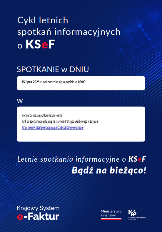 Naczelnik Urzędu Skarbowego w Łukowie zaprasza na bezpłatne spotkanie informacyjne online z cyklu „Letnie spotkania informacyjne o KSeF. Bądź na bieżąco”: