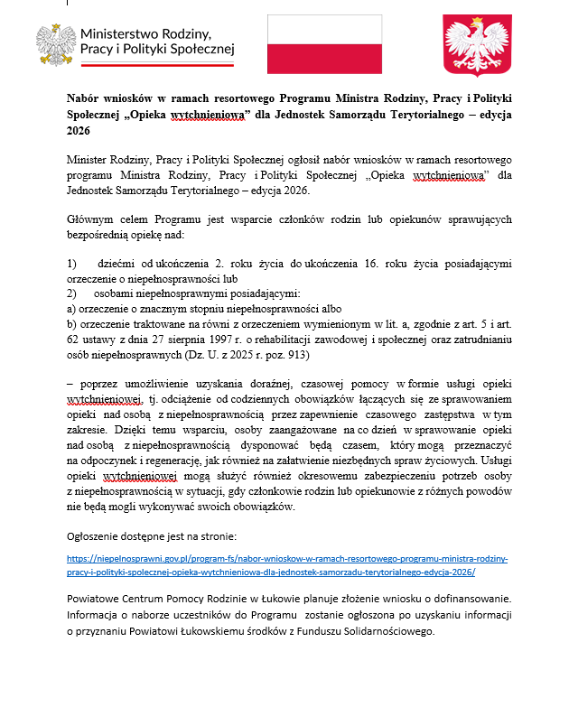 Nabór wniosków w ramach resortowego programu Ministra Rodziny, Pracy i Polityki Społecznej „Opieka wytchnieniowa” dla Jednostek Samorządu Terytorialnego – edycja 2026. Głównym celem Programu jest wsparcie członków rodzin lub opiekunów sprawujących bezpośrednią opiekę.