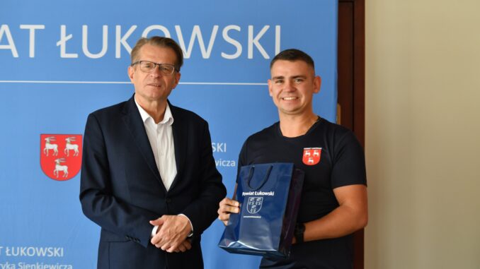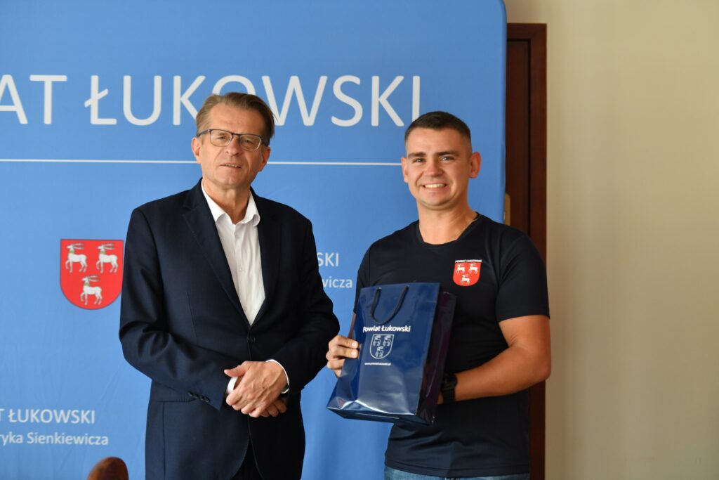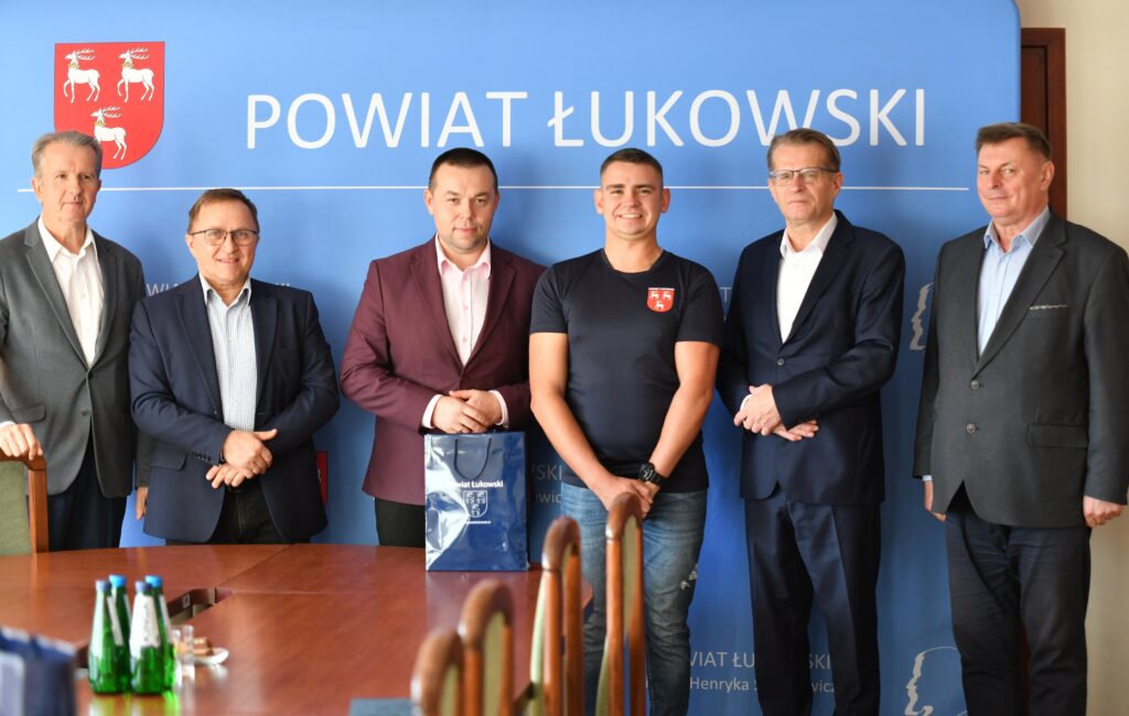 Piotr przed wyjazdem spotkał się ze Starostą Łukowskim Dariuszem Szustkiem, od którego odebrał zestaw gadżetów promocyjnych Powiatu Łukowskiego, które wykorzysta podczas pobytu w Turcji. Sportowiec podziękował za wsparcie i wyróżnienie, podkreślając, że z dumą i pełnym zaangażowaniem będzie reprezentował Powiat Łukowski podczas mistrzostw świata.