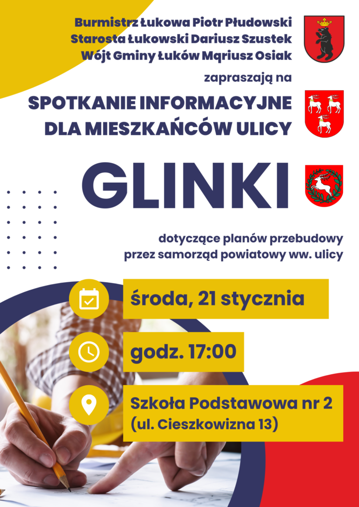 Starosta Łukowski Dariusz Szustek oraz Burmistrz Łukowa Piotr Płudowski i Wójt Gminy Łuków Mariusz Osiak zapraszają właścicieli nieruchomości położonych przy ulicy Glinki na spotkanie informacyjne dotyczące planów przebudowy przez samorząd powiatowy wskazanej drogi.