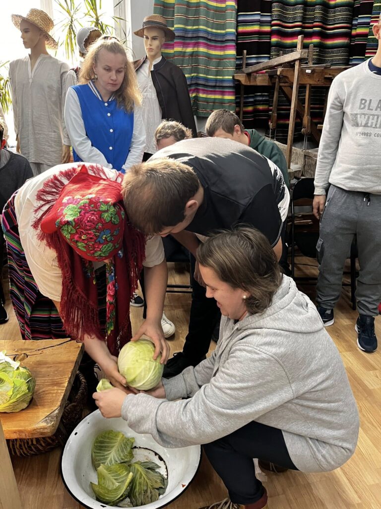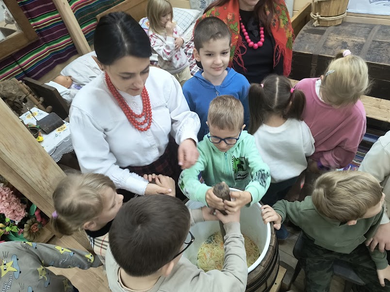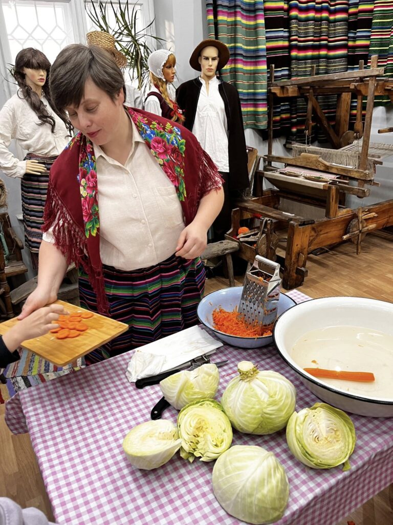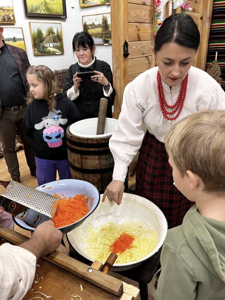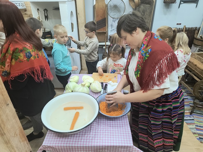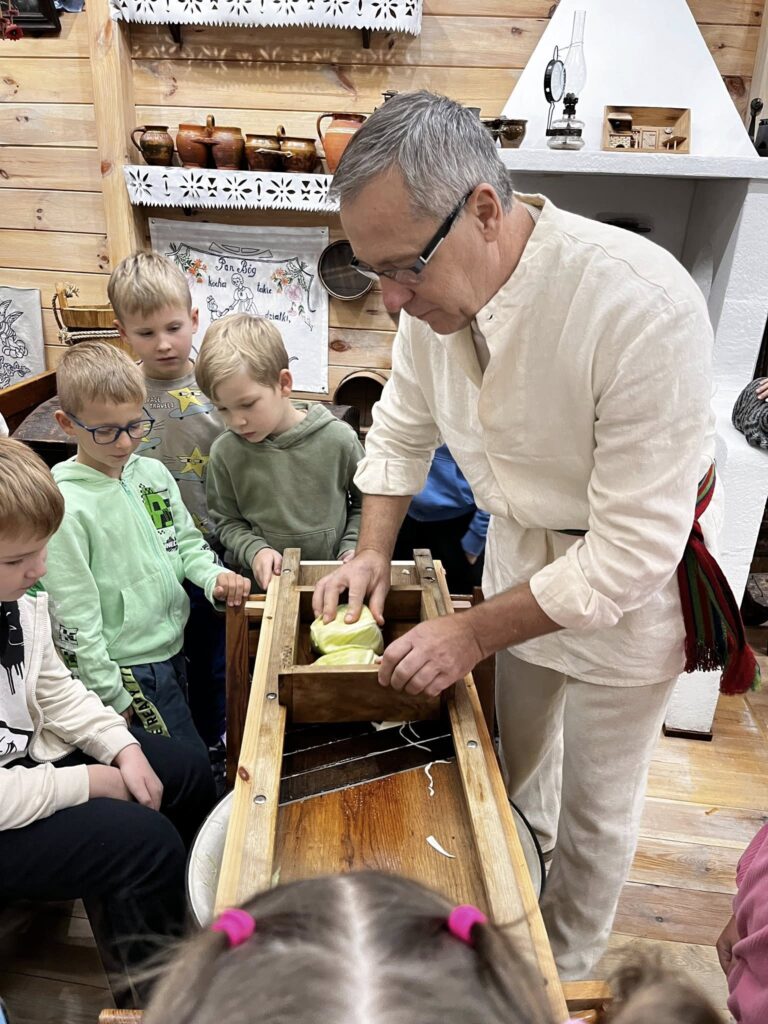 Zajęcia poprowadziła Pani Agnieszka Szaniawska, kustosz muzealny, która opowiedziała o historii kiszenia kapusty oraz o zwyczajach towarzyszących temu jesiennemu zajęciu w dawnych gospodarstwach. Uczestnicy mogli zobaczyć cały proces przygotowania kapusty do kiszenia – od szatkowania i ścierania marchewki, poprzez dodawanie soli i przypraw, aż po tradycyjne ubijanie w beczce.