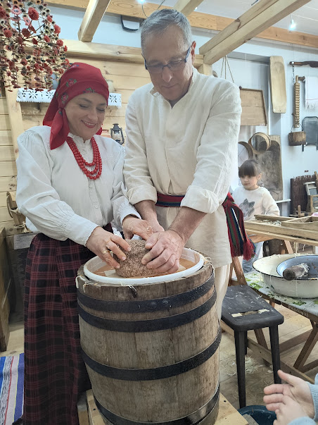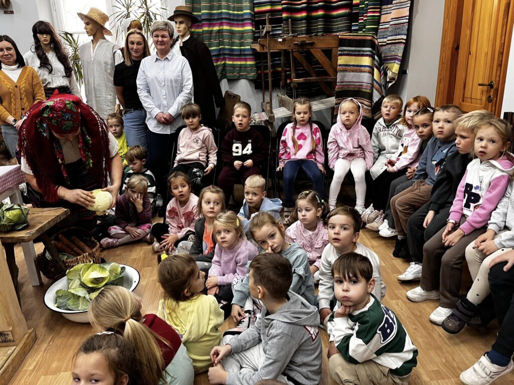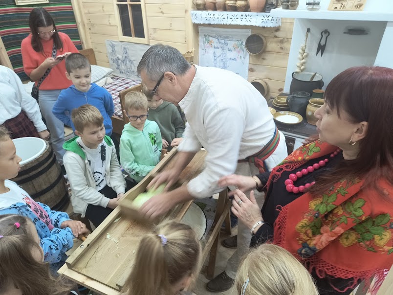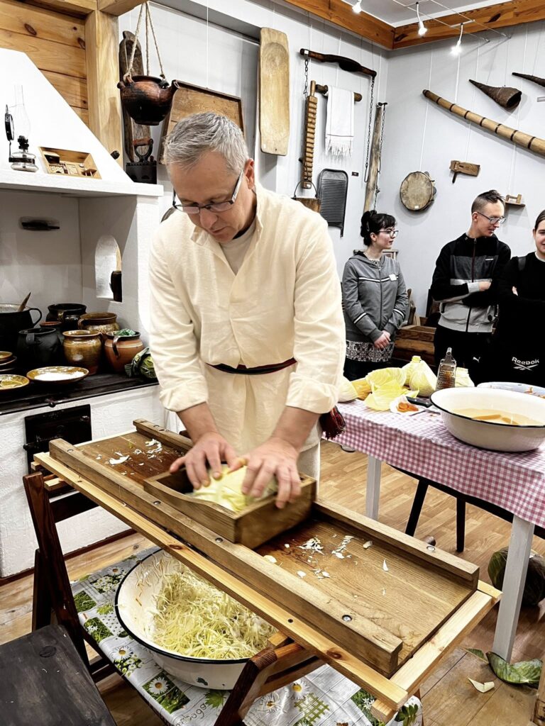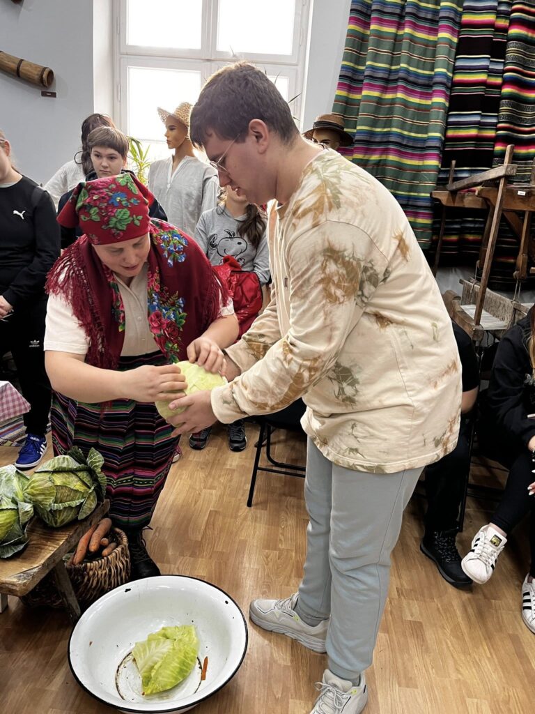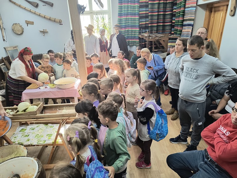 Zajęcia poprowadziła Pani Agnieszka Szaniawska, kustosz muzealny, która opowiedziała o historii kiszenia kapusty oraz o zwyczajach towarzyszących temu jesiennemu zajęciu w dawnych gospodarstwach. Uczestnicy mogli zobaczyć cały proces przygotowania kapusty do kiszenia – od szatkowania i ścierania marchewki, poprzez dodawanie soli i przypraw, aż po tradycyjne ubijanie w beczce.