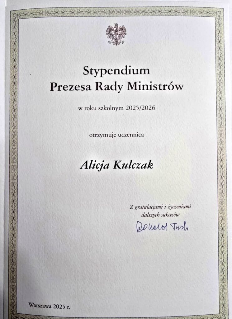 Stypendium Prezesa Rady Ministrów przyznawane jest uczniom osiągającym najwyższe wyniki w nauce oraz wyróżniającym się szczególnymi osiągnięciami edukacyjnymi. Otrzymanie tego wyróżnienia stanowi potwierdzenie wysokiego poziomu wiedzy, systematycznej pracy oraz zaangażowania w rozwój naukowy.