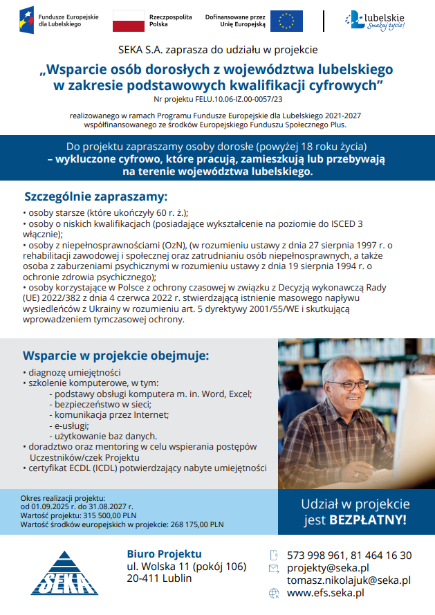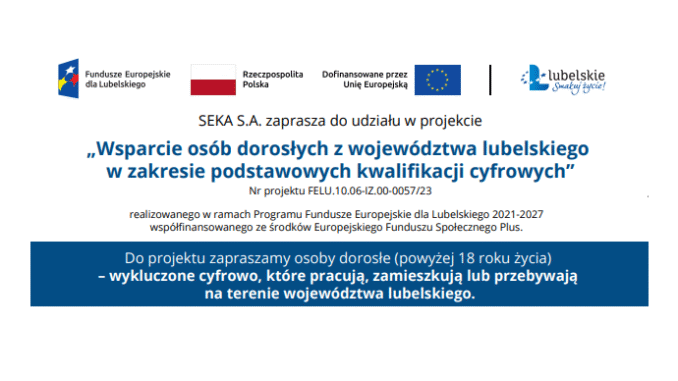 Firma SEKA S.A., realizuje projekt edukacyjny „Wsparcie osób dorosłych z województwa lubelskiego w zakresie podstawowych kwalifikacji cyfrowych”.