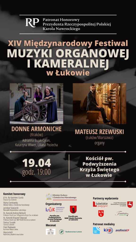 Zapraszamy na 1 koncert XIV Międzynarodowego Festiwalu Muzyki Organowej i Kameralnej w Łukowie. Wydarzenie odbędzie się w niedzielę 19 kwietnia 2026r. o godz. 19:00 w Kościele pw. Podwyższenia Krzyża Świętego w Łukowie. Wystąpią: zespół Donne Armoniche (Kraków): Adrianna Bujak-Cyran, Katarzyna Wiwer i Liliana Pociecha – soprany oraz Mateusz Rzewuski (Łuków/Warszawa) – organy. Partnerami wydarzenia są: Województwo Lubelskie „Lubelskie. Smakuj Życie!”, Powiat Łukowski oraz Fundacja Wydźwięk Kultury.
